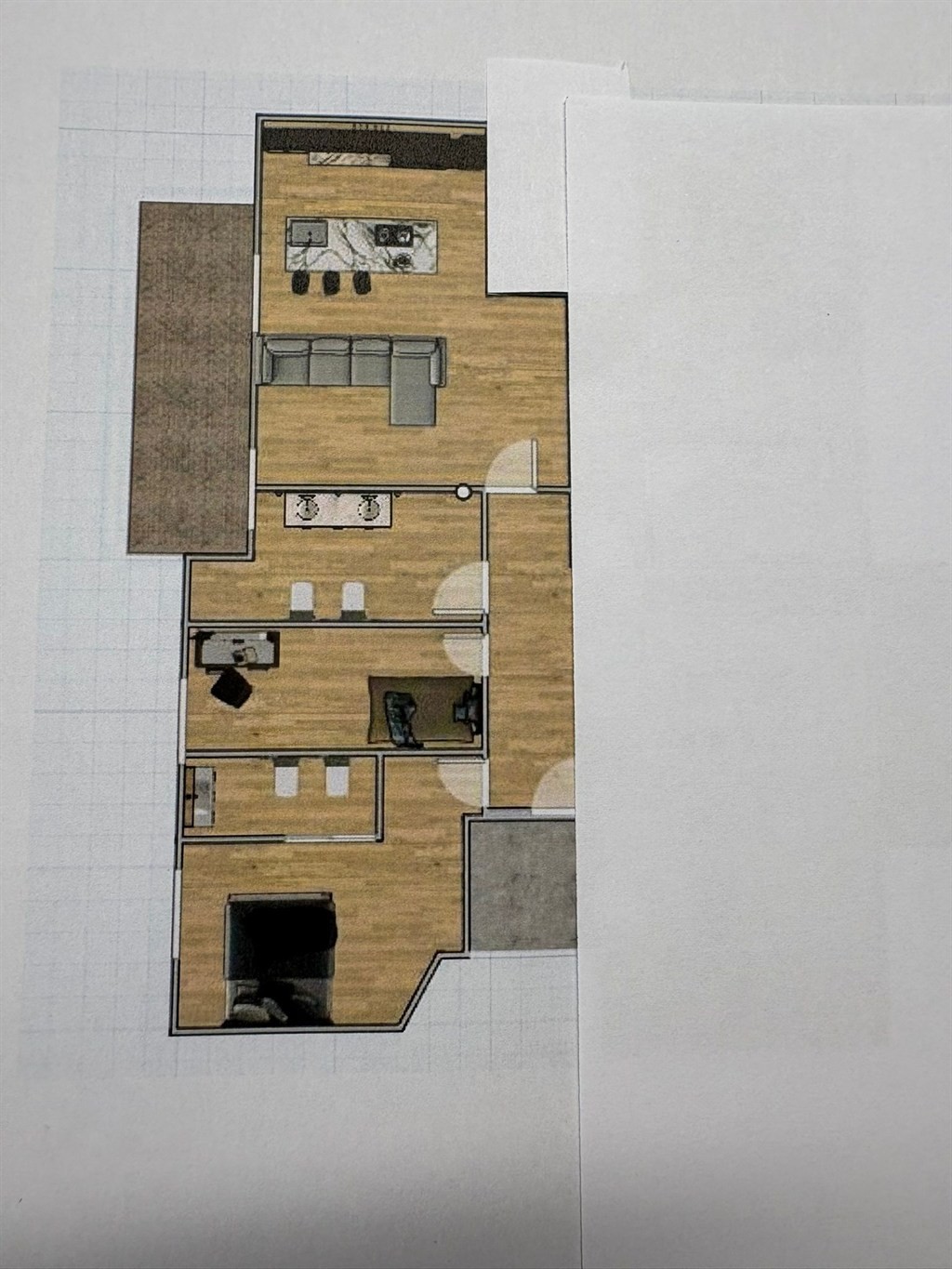 Ampio soggiorno luminoso con cucina a isola di design